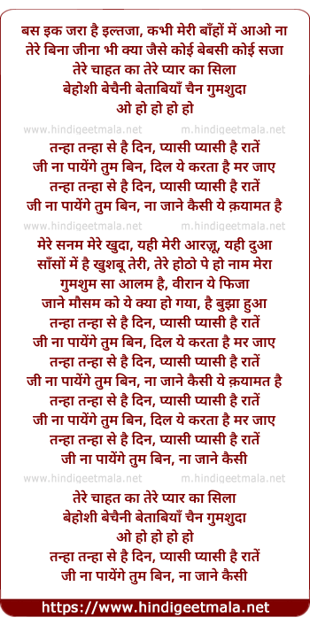 Lyrics of Tanha Tanha Se Hai Din - बस इक जरा है इल्तजा, कभी मेरी बाँहों में आओ ना
