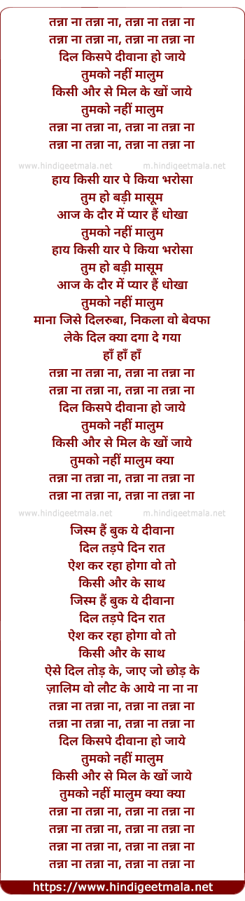 Lyrics of Tanna Na - तन्ना ना तन्ना ना, तन्ना ना तन्ना ना
