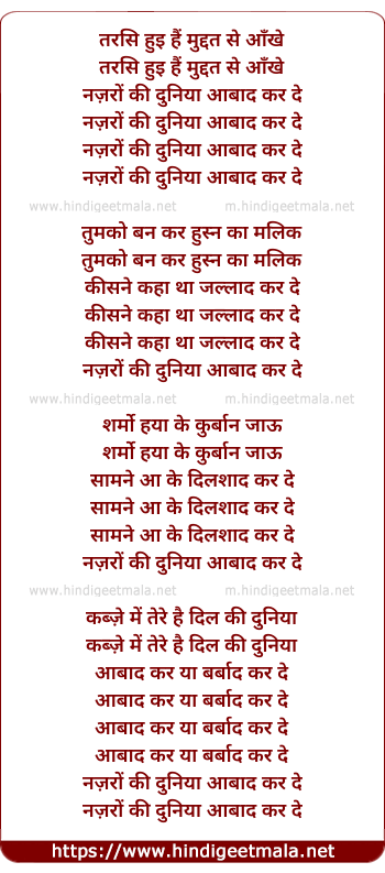 Lyrics of Tarasi Hui Hai Muddat Se Aankhe Nazaro Ki Duniya Aabaad Kar De - तरसी हुइ हैं मुद्दत से आँखे नज़रों की दुनिया आबाद कर दे