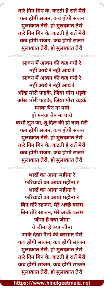 Tare Gin Gin Ke Katati Hai Raat Meri - तारे गिन गिन के, कटती है रातें मेरी