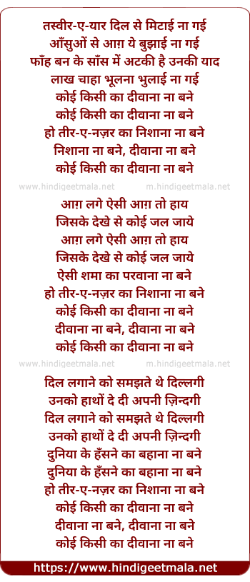 Lyrics of Tasvir E Yaar Dil Se Mitaayi Naa Gayi - तस्वीर-ए-यार दिल से मिटाई ना गई