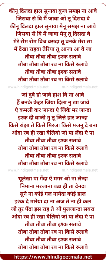 Lyrics of Tauba Tauba Ishq Sataave - कीनू दिलदा हाल सुनावा कुज समझ ना आवे