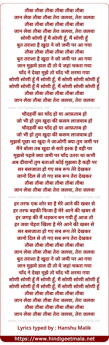 Lyrics of Jaan Levaa Taubaa Taubaa Teraa Jalwaa - जान लेवा तौबा तौबा तेरा जलवा