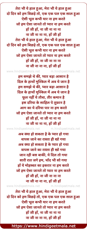 Lyrics of Tera Bhi Ye Haal Huya - तेरा भी ये हाल हुआ
