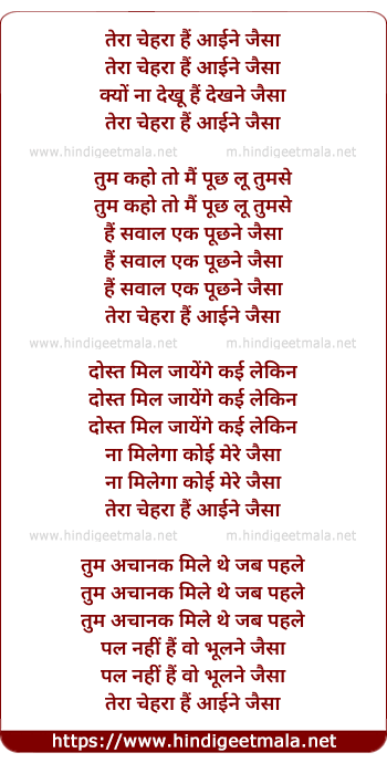 Lyrics of Tera Chehra Hai Aaine Jaisa - तेरा चेहरा हैं आईने जैसा