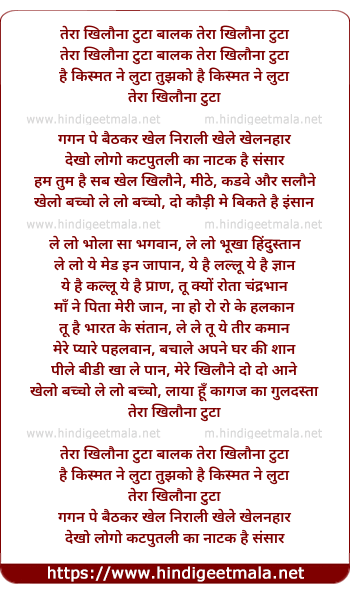 Lyrics of Tera Khilauna Tuta Balak - तेरा खिलौना टुटा बालक