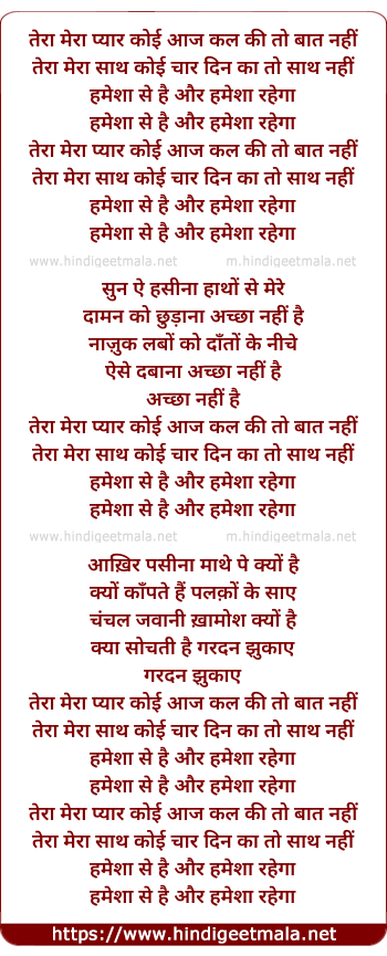 Lyrics of Tera Mera Pyar Koi, Aaj Kal Ki To Baat Nahi - तेरा मेरा प्यार कोई, आज कल की तो बात नहीं