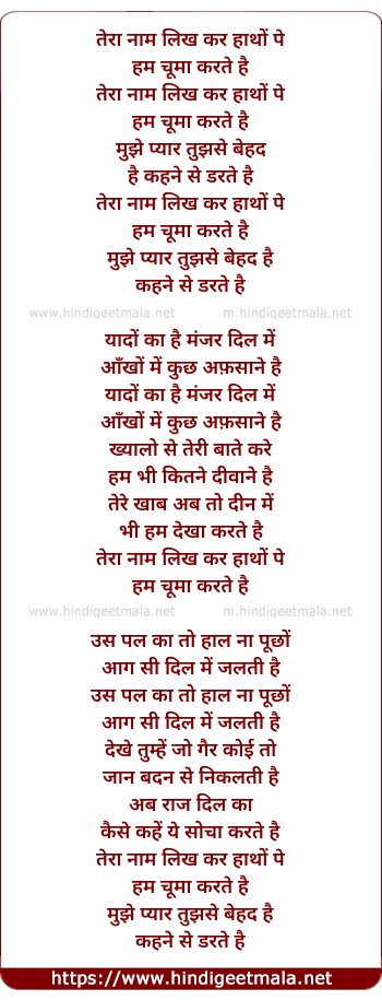 Lyrics of Tera Naam Likh Kar Hatho Pe - तेरा नाम लिख कर हाथों पे
