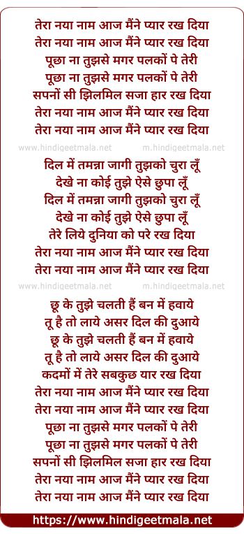 Lyrics of Tera Nayaa Naam - तेरा नया नाम आज मैंने प्यार रख दिया