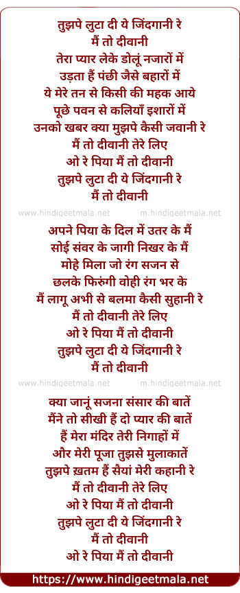 Lyrics of Main To Diwani Tere Liye - मैं तो दीवानी तेरे लिए
