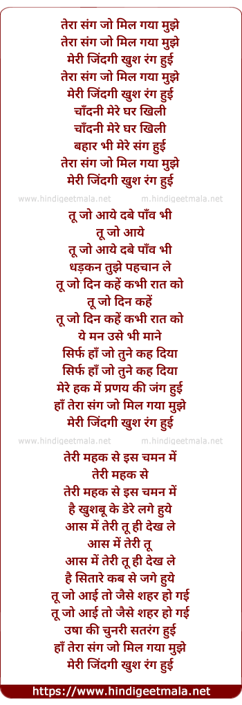 Lyrics of Tera Sang Jo - तेरा संग जो मिल गया मुझे