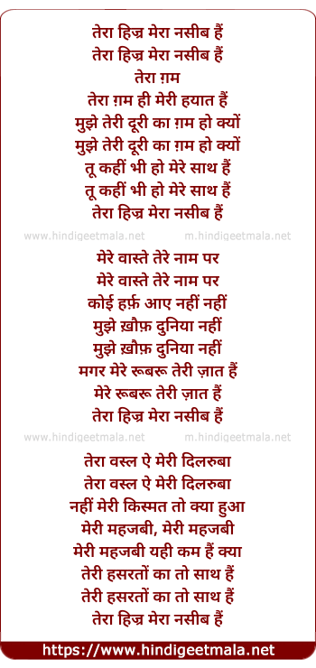 Lyrics of Teraa Hijr Meraa Nasib Hai, Teraa Gam Hi Meri Hayaat Hai - तेरा हिज्र मेरा नसीब है