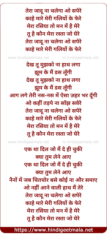 Lyrics of Teraa Jadu Naa Chalega O Sapere - तेरा जादू ना चलेगा ओ सपेरे