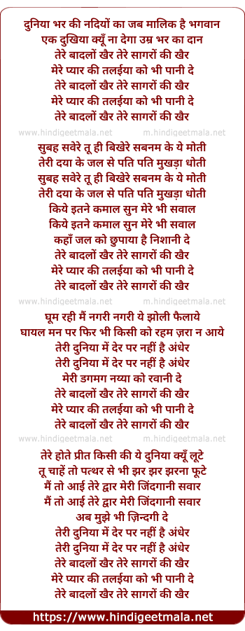 Lyrics of Tere Baadalo Ki Kair Tere Sagaro Ki Kair - तेरे बादलों की खैर तेरे सागरों की खैर
