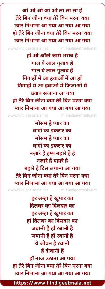 Lyrics of Tere Bin Jina Kya Tere Bin Marna Kya - तेरे बिन जीना क्या तेरे बिन मरना क्या