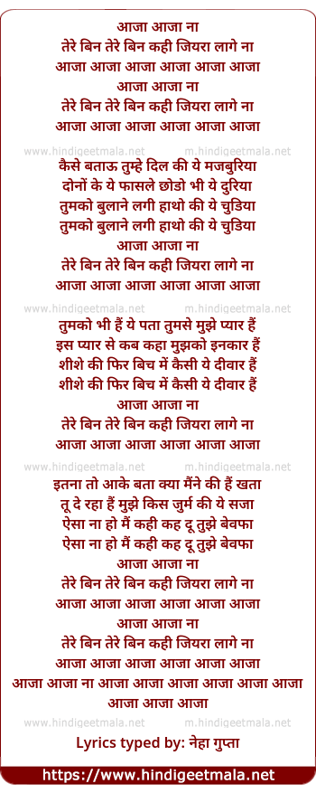 Lyrics of Tere Bin Kahee Jiyara Lage Naa - तेरे बिन कही जियरा लागे ना