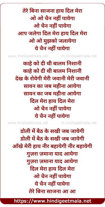 Lyrics of Tere Bina Saajna Dil Mera Chain Nahi Payega - तेरे बिना साजना दिल मेरा चैन नहीं पायेगा