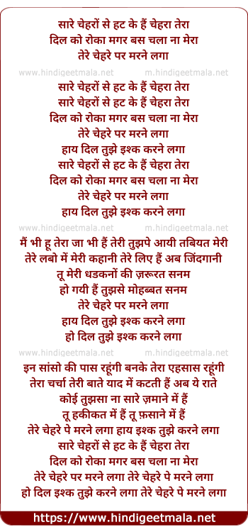 Lyrics of Sare Chehro Se Hatke Hai Chehra Tera - सारे चेहरों से हटके हैं चेहरा तेरा
