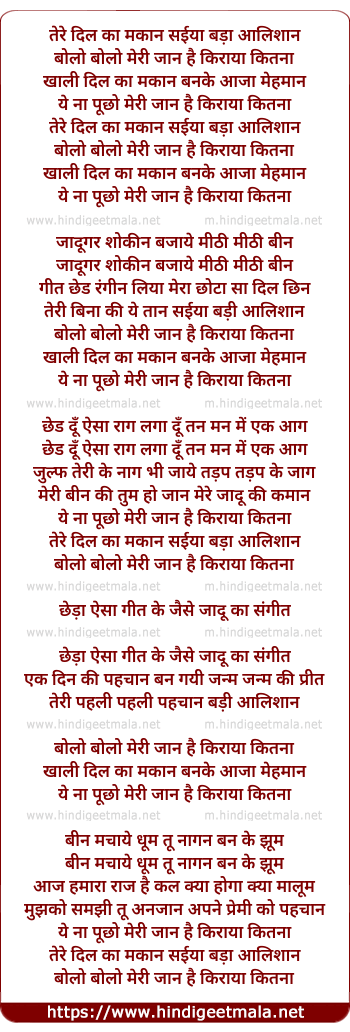 Lyrics of Tere Dil Ka Makaan Saiya Bada Aalishaan - तेरे दिल का मकान सईया बड़ा आलिशान