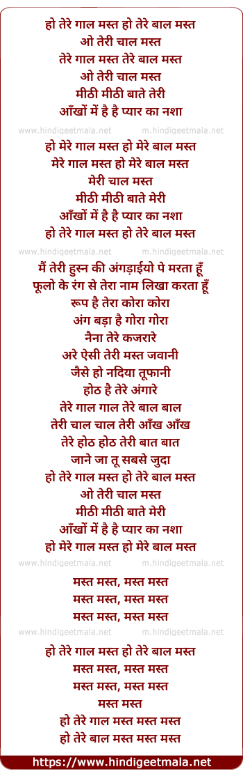 Lyrics of Tere Gaal Mast Tere Baal Mast O Teri Chaal Mast - तेरे गाल मस्त तेरे बाल मस्त ओ तेरी चाल मस्त
