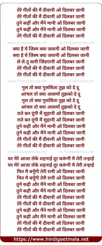 Lyrics of Tere Geeto Ki Main Diwani O Dilbar Jani - तेरे गीतों की मैं दीवानी ओ दिलबर जानी