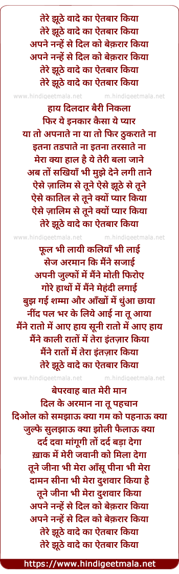 Lyrics of Teree Jhoothe Vade Ka Aetbar Kiya - तेरे झूठे वादे का ऐतबार किया