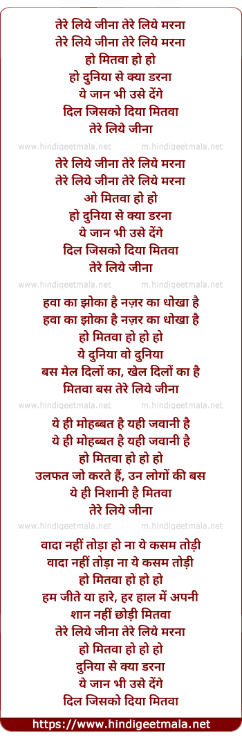 Lyrics of Tere Liye Jina Teri Liye Marna (Mitwa) - तेरे लिये जीना तेरे लिये मरना