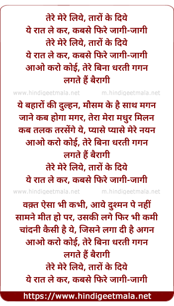 Lyrics of Tere Mere Liye, Taaro Ke Diye - तेरे मेरे लिये, तारों के दिये