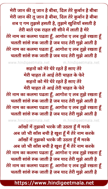 Lyrics of Tere Naam Ka Kalma (Remix) - मेरी जान की तू जान है बीबा, दिल तेरे कुर्बान है बीबा