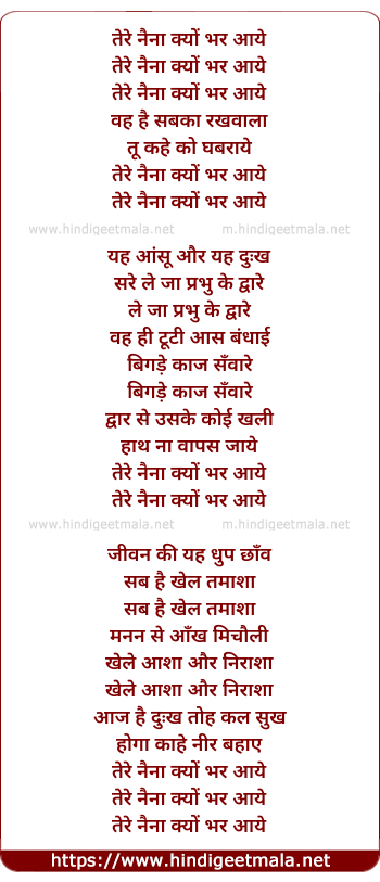 Lyrics of Tere Naina Kyo Bhar Aaye (Female) - तेरे नैना क्यों भर आये