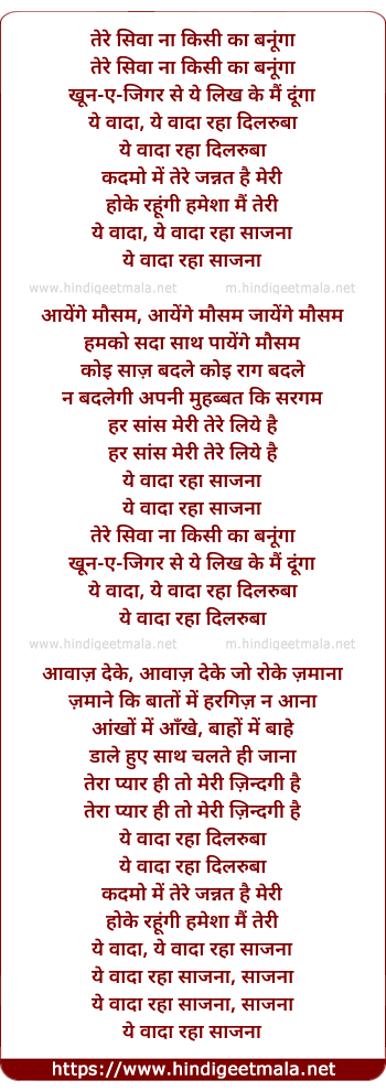 Lyrics of Tere Siwa Na Kisi Ka Banunga, Ye Vada Raha Dilruba - तेरे सिवा ना किसी का बनूंगा, ये वादा रहा दिलरुबा