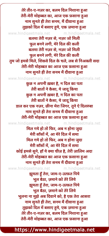 Lyrics of Tere Tir-E-Najar Ka Balam Dil Nishana Huwa - तेरे तीर-ए-नज़र का बलम दिल निशाना हुआ