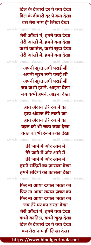 Lyrics of Teri Aankho Mein Humne Kaya Dekha - दिल के दीवारों दर पे क्या देखा