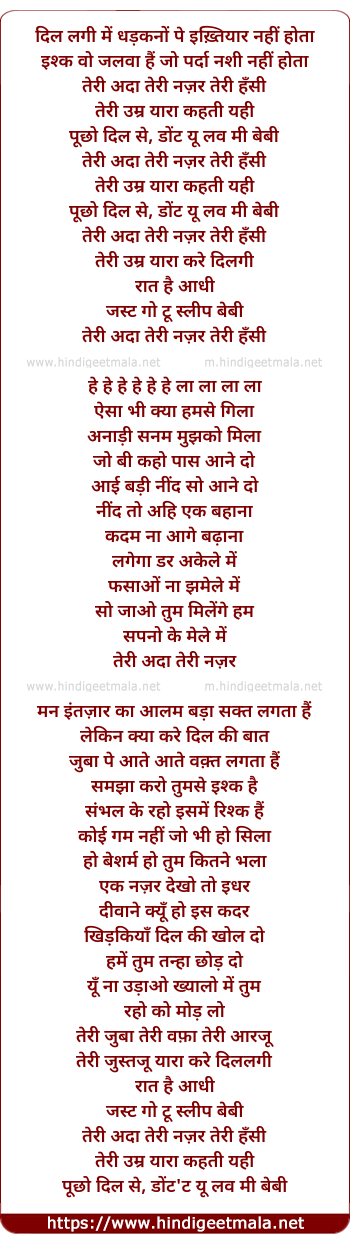 Lyrics of Teri Ada Teri Najar Teri Hasi Teri Umar Yara Kahti Yahi (Don'T You Love Me) - दिल लगी में धड़कनों पे इख़्तियार नहीं होता