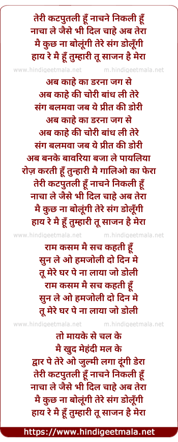 Lyrics of Teri Kathputli Hun Naccne Nikli Hu - तेरी कटपुतली हूँ नाचने निकली हूँ