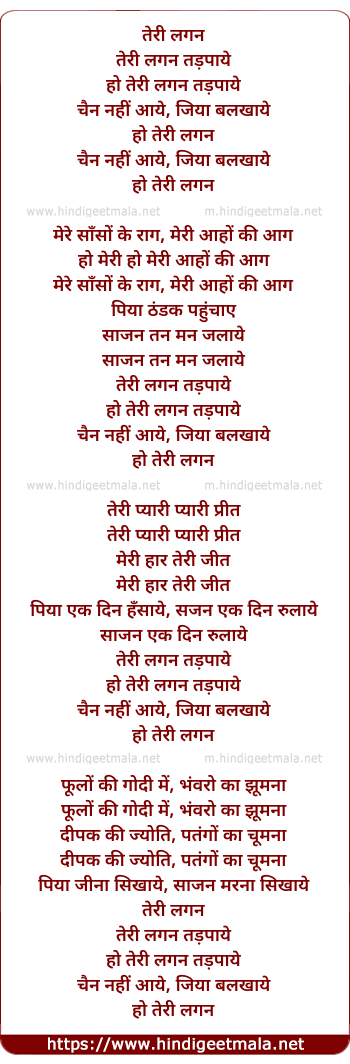 Lyrics of Teri Lagan Tadpaye Chain Nahi Aaye - तेरी लगन तड़पाये चैन नहीं आये
