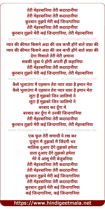 Lyrics of Teri Meherbaniyan Teri Kadardaniya - तेरी मेहरबानियाँ तेरी कदरदानीयाँ