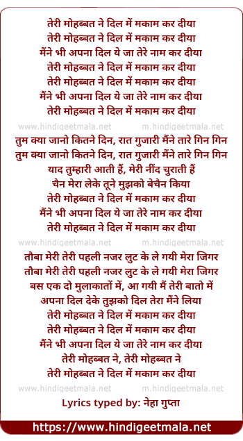 Lyrics of Teri Mohabbat Ne Dil Me Makam Kar Diya - तेरी मोहब्बत ने दिल में मकाम कर दिया