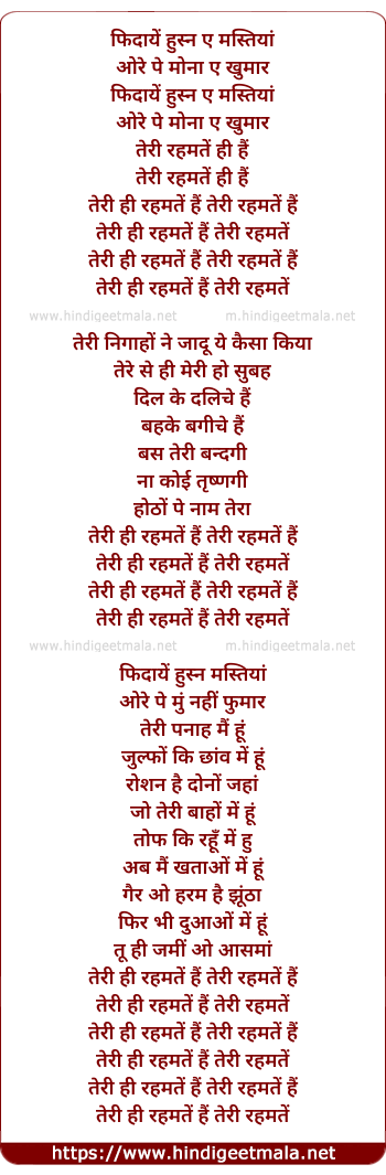Lyrics of Teri Rehmate - फिदायें हुस्न ए मस्तियां