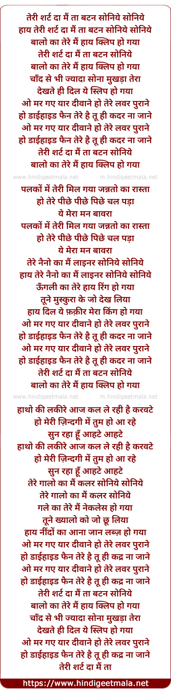 Lyrics of Teri Shirt Da Mai Ta Button Soniye - तेरी शर्ट दा मैं ता बटन सोनिये