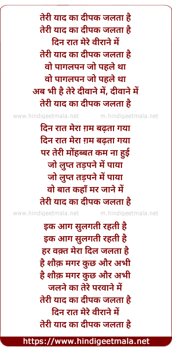 Lyrics of Teri Yaad Ka Dipak Jalata Hai - तेरी याद का दीपक जलता है