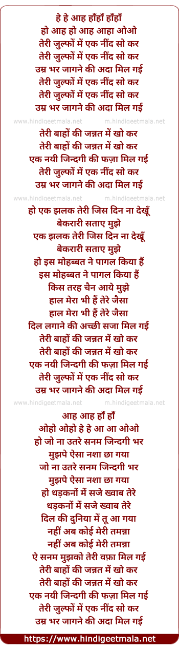Lyrics of Teri Zulfo Me Ek Nind - तेरी जुल्फों में एक नींद