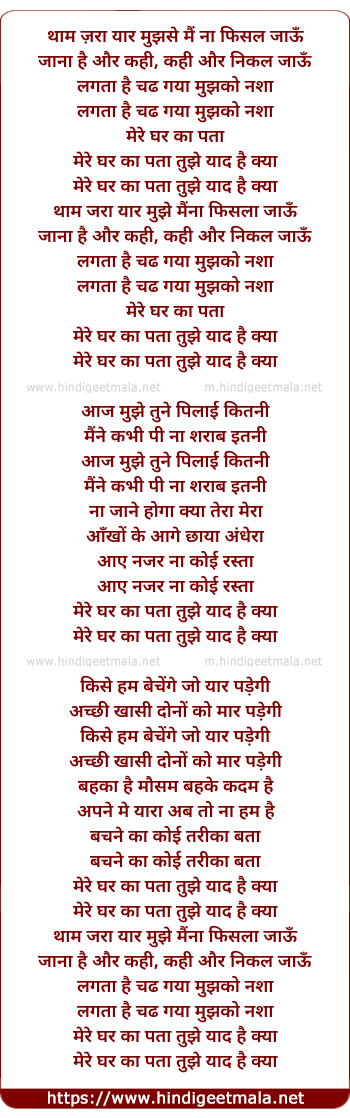 Lyrics of Tham Zara Yaar Mujhe Mai Na Fishal Jaau - थाम ज़रा यार मुझसे मैं ना फिसल जाऊँ