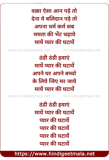 Lyrics of Thandi Thandi Hawaye Maayein Pyar Ki Ghataye - ठंडी ठंडी हवाएं मायें प्यार की घटायें