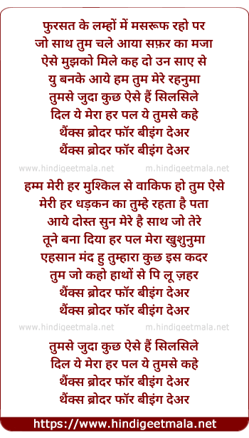 Poetic Translation - Lyrics of Thanks Brother For Being There - थैंक्स ब्रोदर फॉर बीइंग देअर