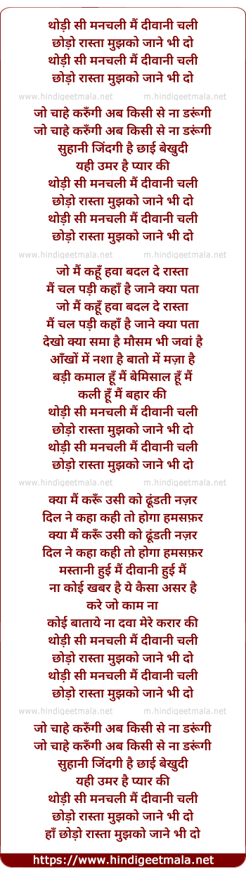 Lyrics of Thodi Si Manchali Mai Diwani Chali - थोड़ी सी मनचली मैं दीवानी चली