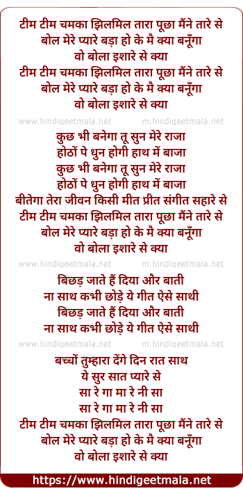 Lyrics of Tim Tim Chamka Jhilmil Tara Pucha Maine - टीम टीम चमका झिलमिल तारा पूछा मैंने