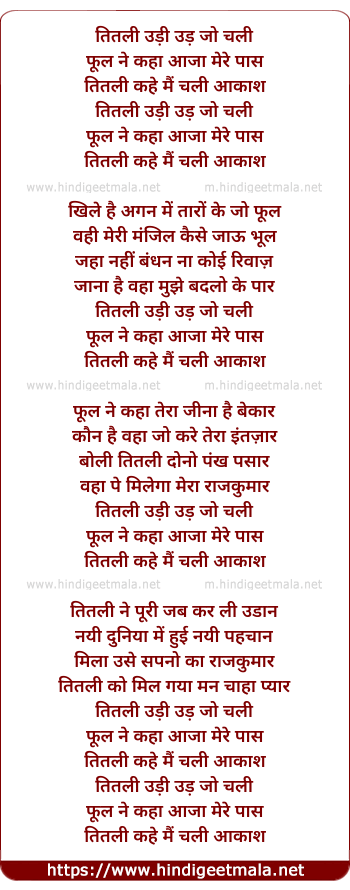 Lyrics of Titli Udi, Ud Jo Chali Phool Ne Kaha Aaja Mere Paas - तितली उड़ी उड़ जो चली फूल ने कहा आजा मेरे पास