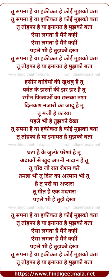 Lyrics of Tu Sapana Hai Ya Hakikat - तू सपना है या हकीकत