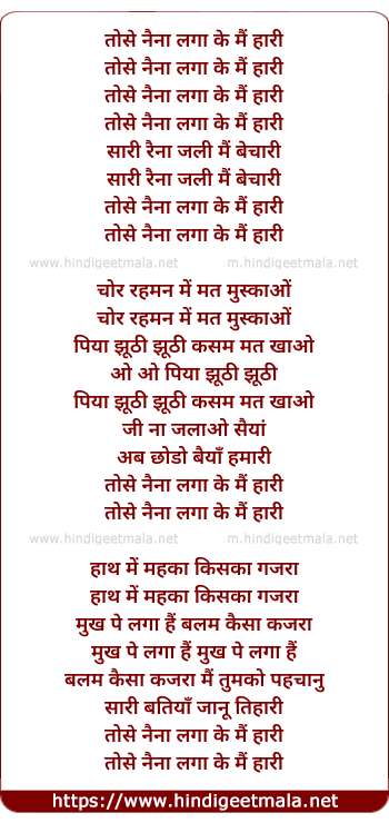 Lyrics of Tose Naina Laga Ke Mai Hari - तोसे नैना लगा के मैं हारी